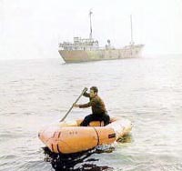 Ich blendete die aufgebrachte See unter mir aus und stürzte mich auf die Strickleiter. Hilfreiche Hände zogen mich nach oben - ich war da. Als erste Person bei Radio NorthSea International, seit die Station nach England gekommen ist. Zwei Discjockeys waren anwesend, um sich mit mir zu treffen: Carl Mitchell, 23 Jahre, aus New York, bärtig, mit Wildlederjacke und zuversichtlich, und Alan West, 22 Jahre, aus Morden, nur 5 Fuß 6 Inches groß und noch viel bescheidener, als es seine Größe vermuten lässt. Die beiden führten mich unter Deck in ihre Lounge, die mehr wie ein Besprechungszimmer in der Vorstandsetage aussieht, als eine Kabine in einem 690 Tonnen schweren Piratenschiff. Derzeit sind drei englischsprachige DJs an Bord. Alan moderiert vier Stunden pro Tag, Carl fünf und Mark Wesley, 22, aus Thundersley in Essex, ebenfalls fünf. Außerdem ist da ein deutschsprachiger DJ. Drei andere sind gerade an Land und werden in der nächsten Woche zurück erwartet. Es arbeiten zwei Ingenieure an Bord, die sich um das Radioequipment kümmern, sowie eine achtköpfige Schiffsmannschaft, allesamt Holländer.“